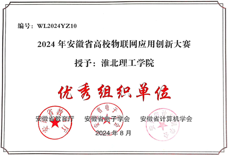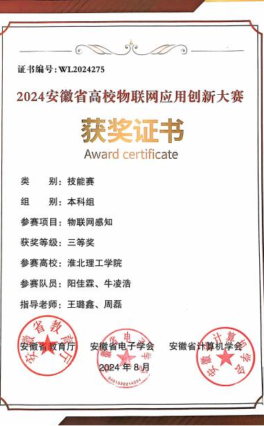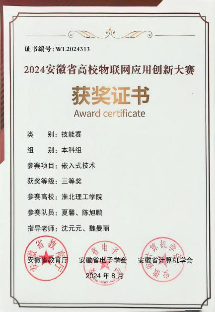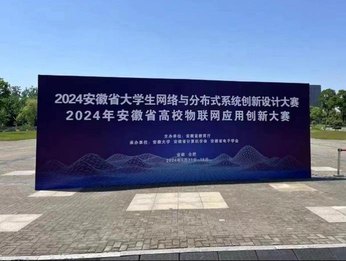 2024年5月11日至18日,万象城官网曹新建、王璐鑫和李硕儒等作为指导老师带领夏馨、陈旭鹏、阳佳霖、孙亚楠等学生参加安徽省高校物联网应用创新大赛,大赛由安徽省教育厅主办、安徽大学和安徽省计算机学会、安徽省电子学会承办,整个比赛过程充分展现了万象城awcsport官网学子较扎实的理论功底、实操能力和良好精神风貌。