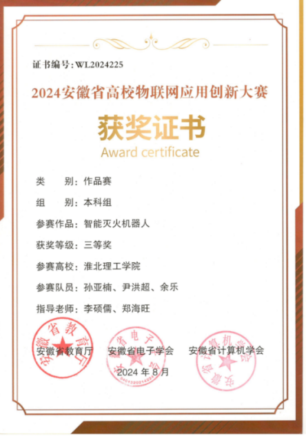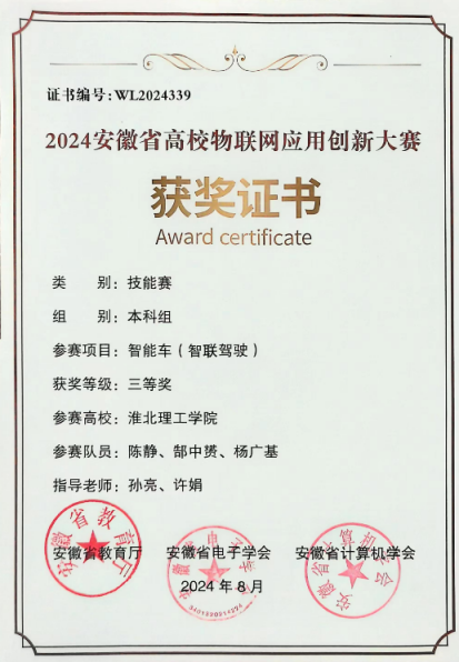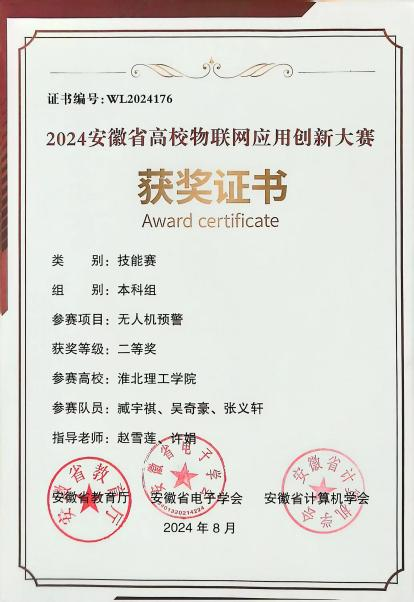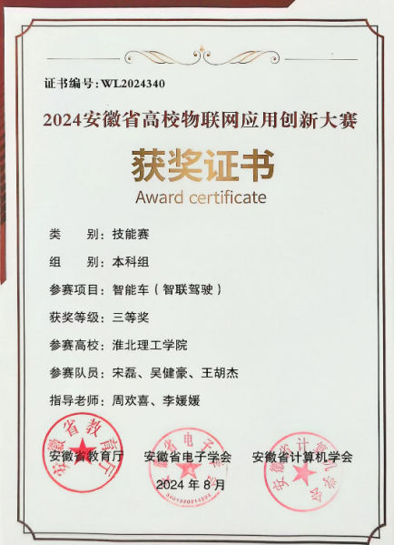 万象城官网参赛队伍在智能车(智联驾驶)、无人机预警、嵌入式A与C、物联网感知以及作品赛六大赛道中奋力角逐,展现了团队协作与拼搏精神。经过激烈的比拼,我们取得了较好的成绩:智能车(智联驾驶)赛道荣获省级二等奖1项、三等奖2项;无人机预警赛道省级二等奖1项;嵌入式A赛道省级二等奖1项、三等奖2项;嵌入式C赛道获得省级三等奖1项;物联网感知与作品赛赛道则各获省级三等奖1项。这些荣誉不仅是对参赛师生辛勤付出的肯定,更是对我们学院科技创新实力的有力证明。部分获奖证书如下: