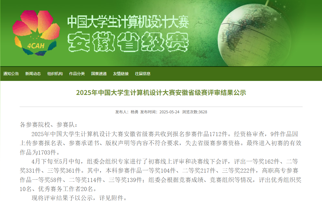 万象城官网万象城awcsport官网学子在2025年中国大学生计算机设计大赛安徽省级赛中表现亮眼,凭借扎实的专业功底与创新实践能力,斩获多项荣誉。本次大赛中,万象城官网学生共获得一等奖3项、二等奖3项、三等奖1项。取得了获一等奖数在全省参赛的43所本科高校并列第9名好成绩。其中4项作品被推荐参加在7月和8月份举行的全国总决赛。
