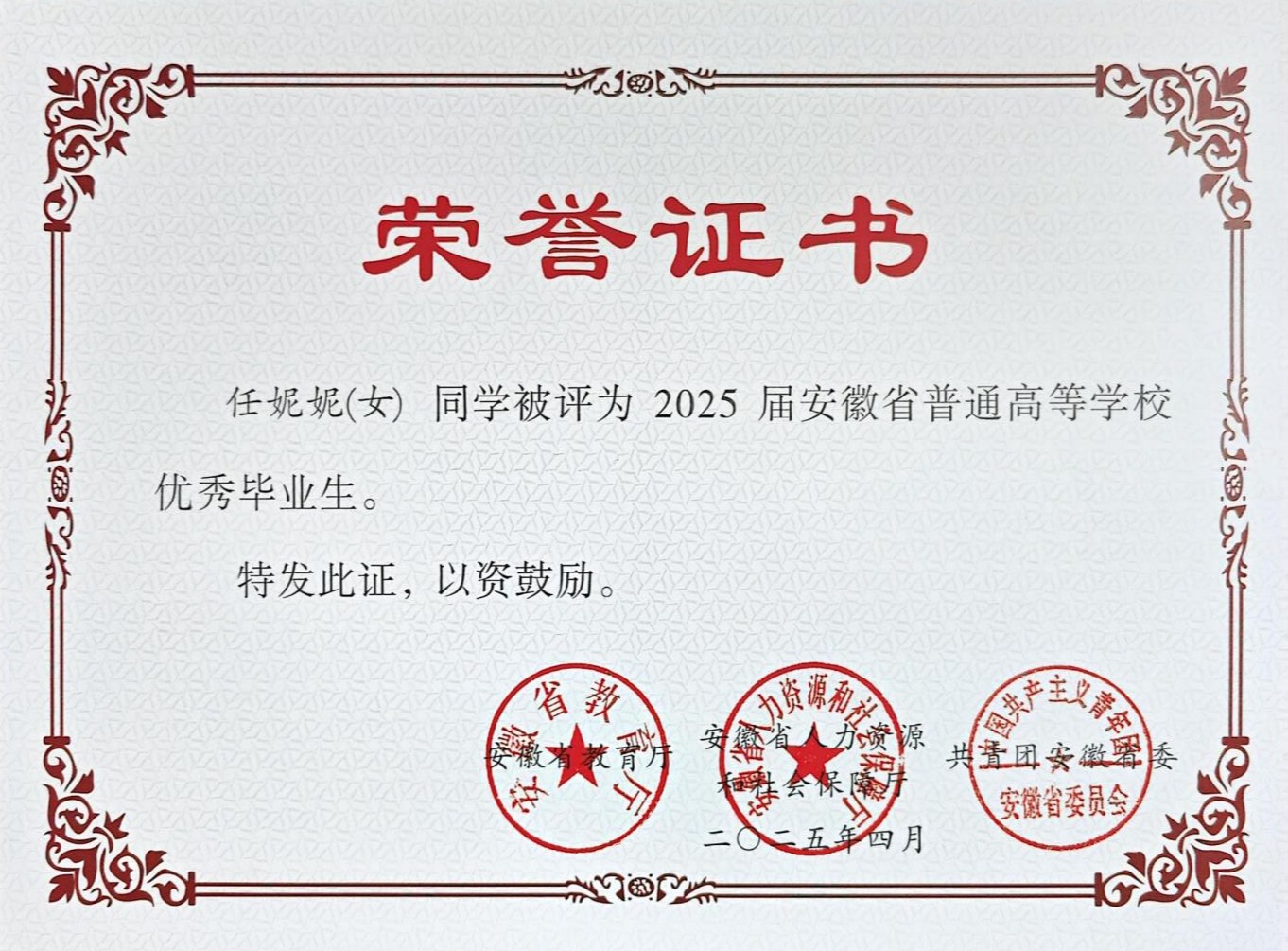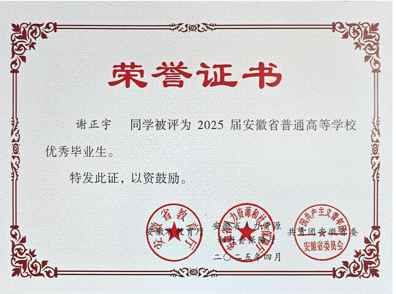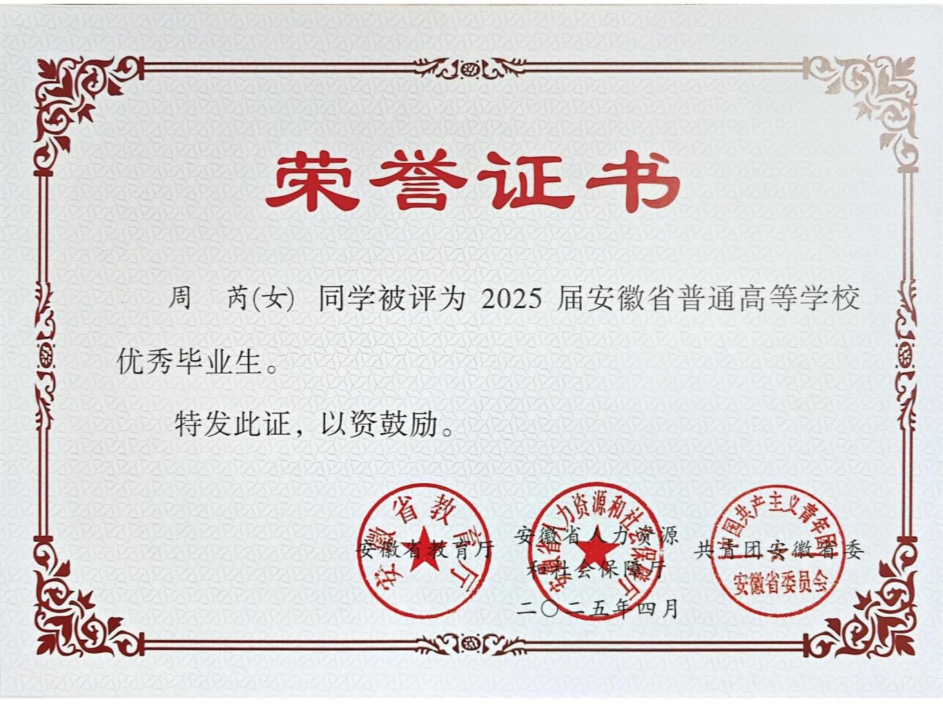 奖学金荣誉:曾获2021-2022学年校级三好学生、2021-2022学年校级特等奖学金、2021-2022学年校级优秀学生干部、2022-2023学年校级特等奖学金、2022-2023学年校级优秀学生干部、2023-2024学年校级三好学生、2023-2024学年校级特等奖学金、2025届校级优秀毕业生。