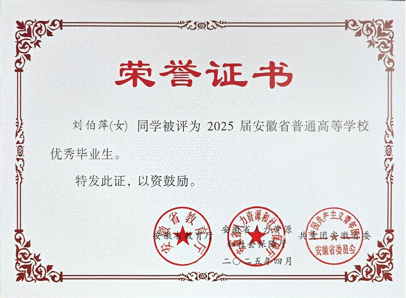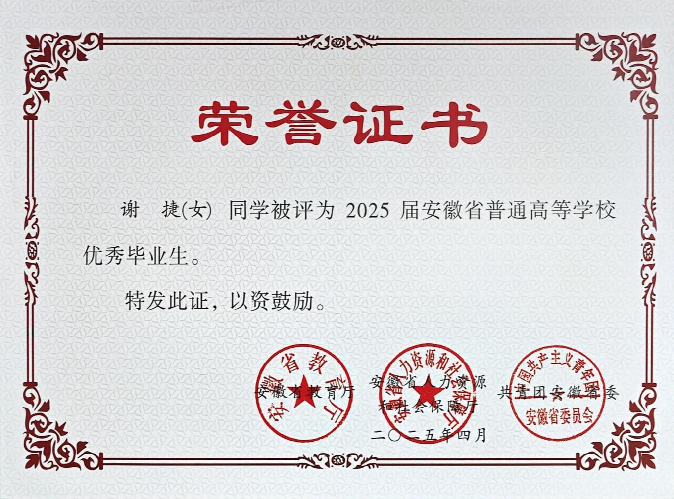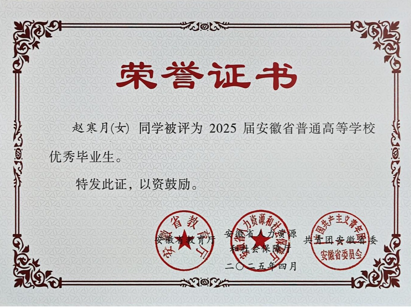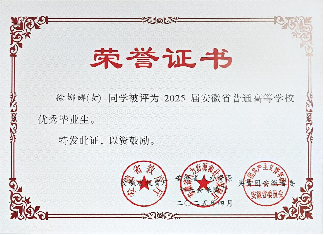 奖学金荣誉:曾获2021-2022学年校级三好学生、2021-2022学年校级特等奖学金、2021-2022学年校级优秀学生干部、2022-2023学年校级特等奖学金、2022-2023学年校级优秀学生干部、2023-2024学年校级三好学生、2023-2024学年校级特等奖学金、2025届校级优秀毕业生。