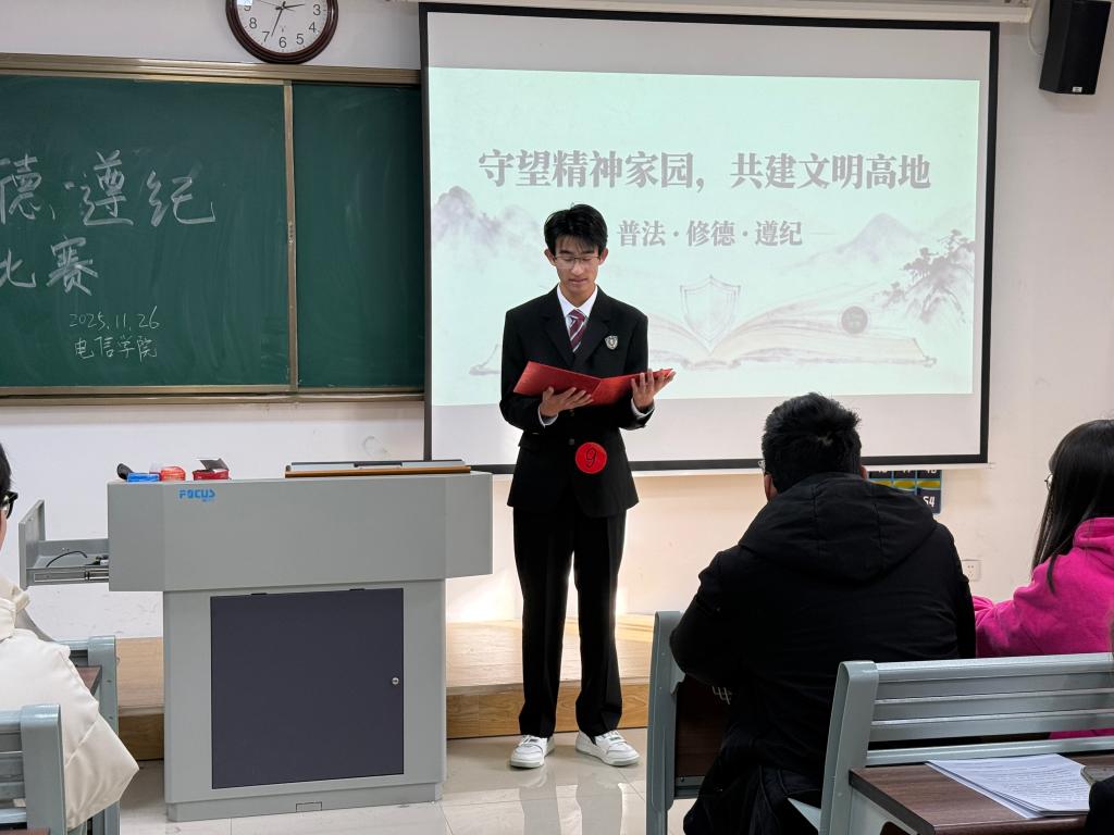 最后,本次演讲比赛圆满收官,评委团们评选出胡灿、苌婉波、晁鸿博等多位优秀演讲选手,他们以声传情、以言践行,生动诠释了普法修德、遵纪守礼的深刻内涵。愿全体学生以获奖者为榜样,凝心聚力,让文明之花绽满校园每个角落。赛场之上的每一句铿锵誓言、每一段真挚分享,都转化为“守望精神家园、共建文明高地” 的生动实践,凝聚起全院学生崇法向善、遵规守纪的强大共识!