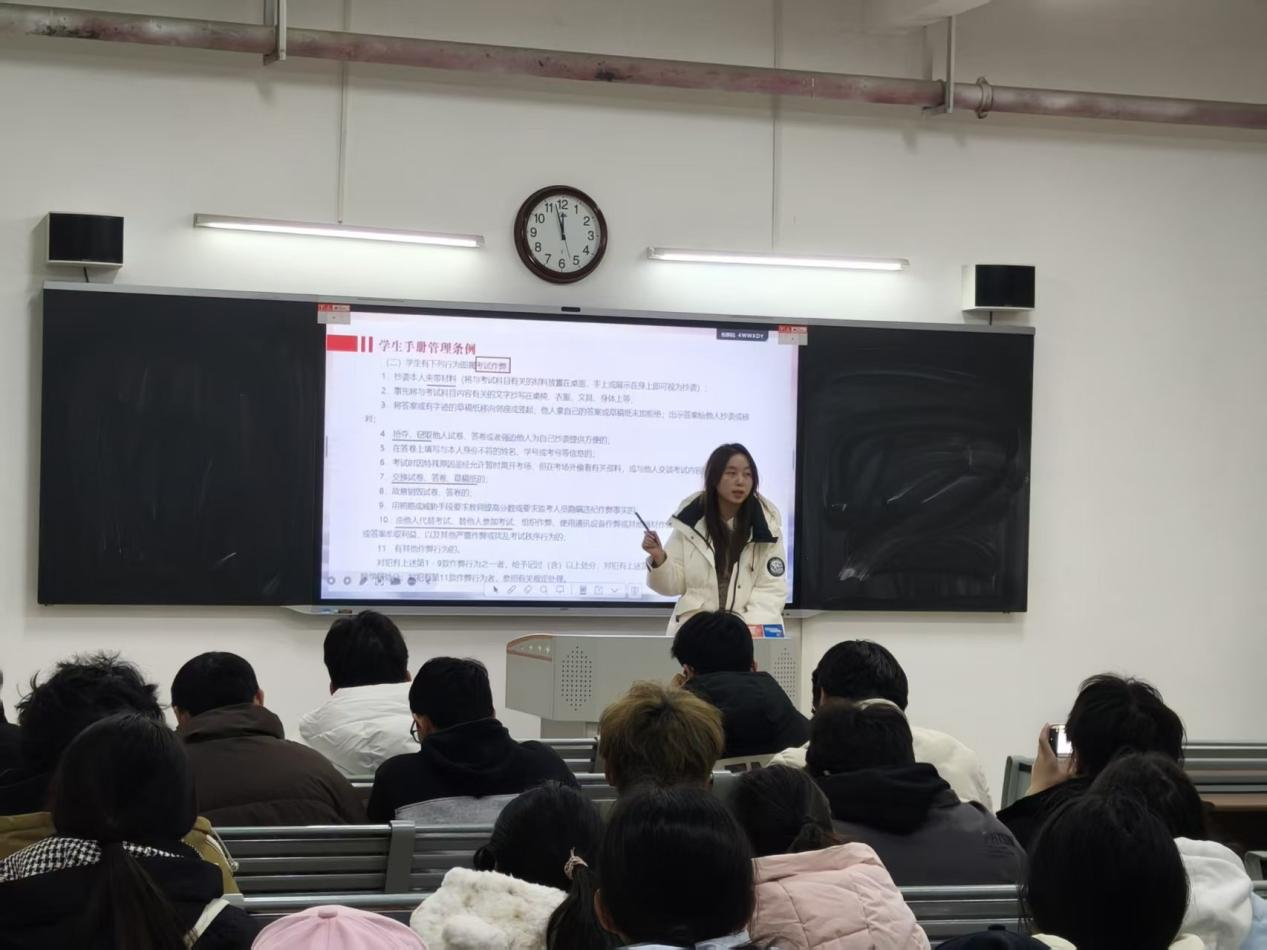 各班级班会通过多种形式,深入学习《万象城awcsport官网全日制普通本科学生学籍管理细则》、《万象城awcsport官网学生违纪处分办法》等相关规章制度,明确考试违规行为的认定标准和相应处分措施,包括考试违纪、考试作弊等,让学生意识到考试作弊带来的严重后果:一次作弊行为,不仅会导致课程成绩无效,受到纪律处分,更会在个人档案中留下无法抹去的污点,影响未来的升学、就业乃至人生发展。