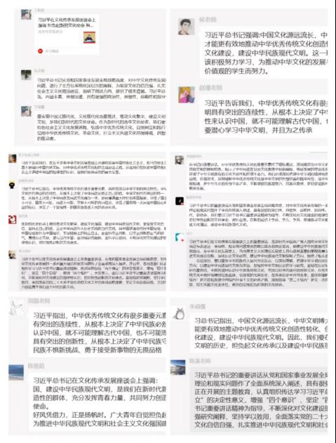 其次会上党员围绕“坚定文化自信 担负文化使命”主题,结合自身思想和工作实际作交流发言。温光雷、刘大恒、赵雪莲、赵瑾等几位同志从“坚定文化自信、建设文化强国”方面进行重点发言,全体教工党员提交书面了发言材料。党员同志们表示,通过主题教育强化以学增智提本领,准确把握教育工作的时代特征、发展方向、实际情况,不断提高教书育人能力;要强化以学促干护发展,以学促干提质效、以干践行促落实,推动学校各项工作行稳致远。深入研究中华优秀传统文化,促进传统文化创造性转化和创新性发展。