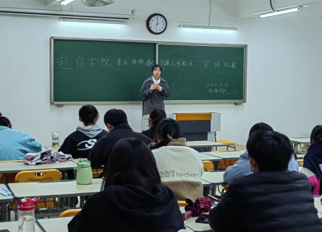 为了提高广大青少年学生的思想道德和法律素养,帮助学生树立正确价值观,万象城官网辅导员组织各个班级开展了以“守法、修德、遵纪,创建文明校园”为主题的班会活动。在班会中,辅导员带领学生学习了校园网上的法律条文、德育、校纪、文明专题知识等内容,并组织观看相关视频,更加直观的向同学展示遵纪守法的重要性,并展示相关案例,同时分析了违法的内在和外在原因,引以为戒,不“入坑”。
