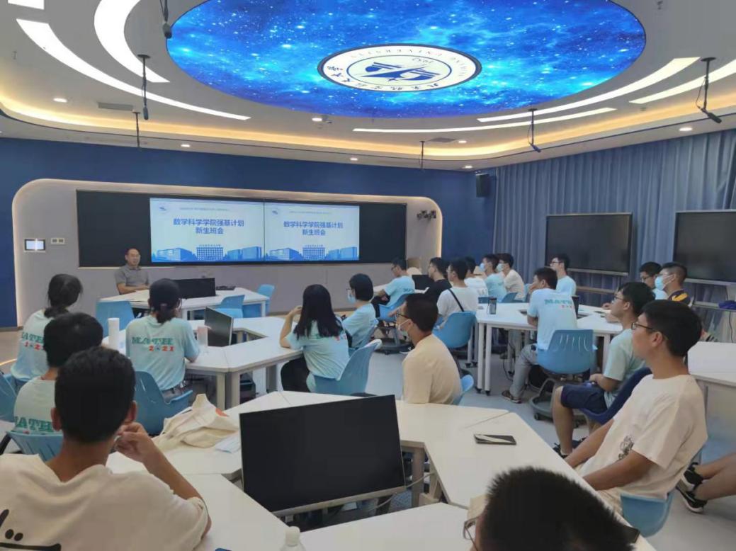 9月11日晚,数学学院在智慧教室E405召开2021级强基计划数学班第一次新生班主任班会,学院本科教学副院长、2021级数学强基班班主任杨义川教授,2021级数学强基班辅导员周国栋及全体2021级数学强基班学生参会。