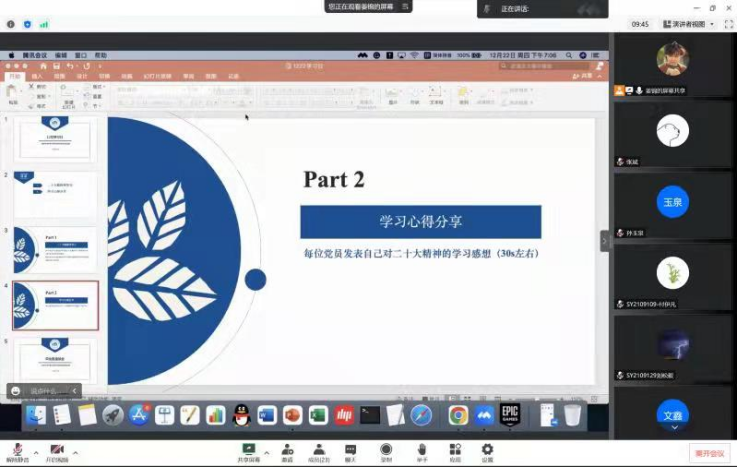 最后,经过这段时间党的二十大精神学习,支部每位党员都收获颇丰,大家结合自身实际纷纷发表了学习感言。支部书记玉泉老师做出总结,党的二十大精神对我们是一个很好的鼓舞,大家需要不断学不断深入学参照原文学,并指出疫情之下,青年人要有自己的判断,要有自己的定力,作为党员主动向周围提供帮助,传递更多的温暖。