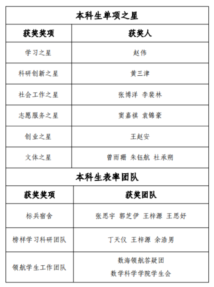 11月16日,2022年“数学之星”评选正式启动。经“数学之星”评审委员会函评与学院内公示, 赵伟、黄三津、窦嘉祺、王浩天、姜亦申、刘泽蕙等15人获评单项之星,数海领航答疑团等6支团队获评表率团队,许多、李泽彤、岳泽阳、陈永鑫、于晟伟、穆欢等29人获评优秀奖,金年会jinnianhuicom学生会等6支团队获评优秀团队。
