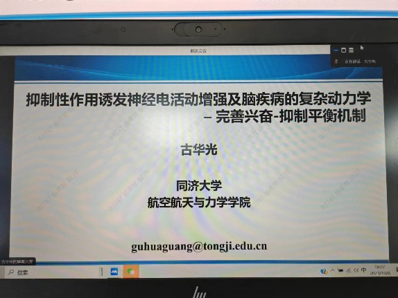 10月8日下午,应用数学系邀请同济大学航空航天与力学学院古华光教授,进行了 “抑制性作用诱发神经电活动增强及脑疾病的复杂动力学”的线上学术报告。 此次报告由邀请人杨卓琴老师主持,应用数学系主任郑孝信老师及相关研究领域的师生参加了本场报告。