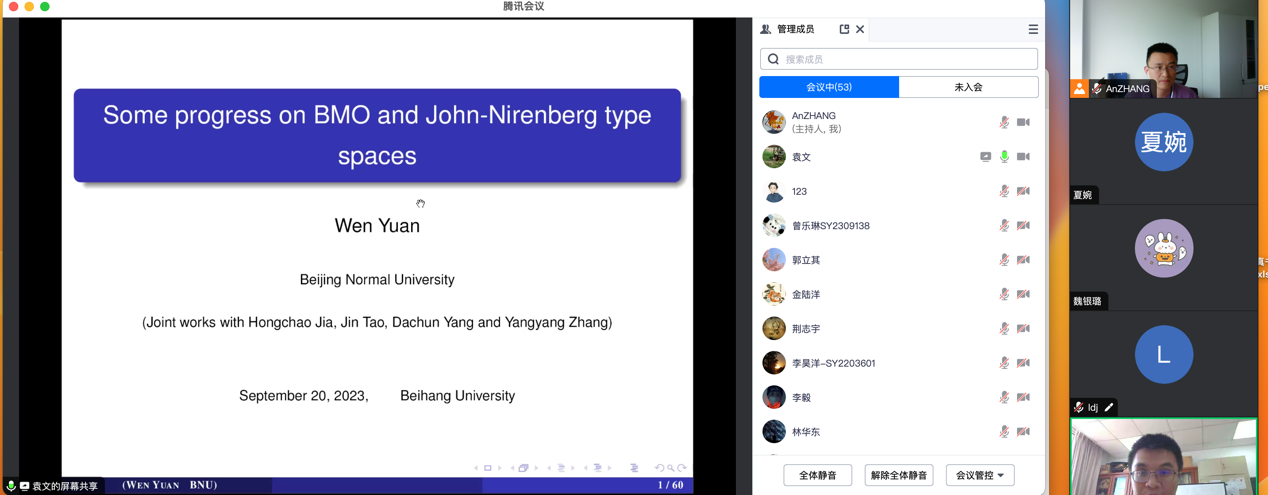 2023年09月20日,北京师范大学袁文教授,应邀为金年会jinnianhuicom师生做了题为 “Some progress on BMO and John- Nirenberg type spaces”的学术报告。报告由张安老师主持。