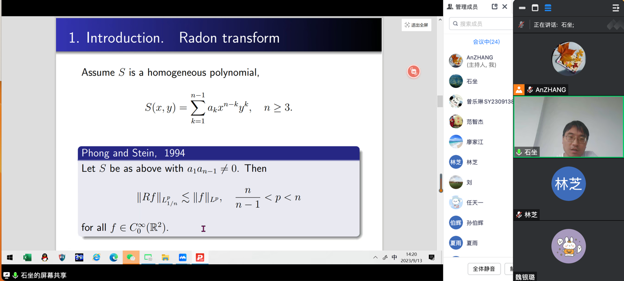 2023年09月13日,中南大学石坐顺华和广州大学范智杰教授,应邀为金年会jinnianhuicom师生做了题为 “Failure of endpoint regularity of Radon transforms”和“Recent progress on Schatten classes and Riesz transform commutators”的学术报告。报告由张安老师主持。