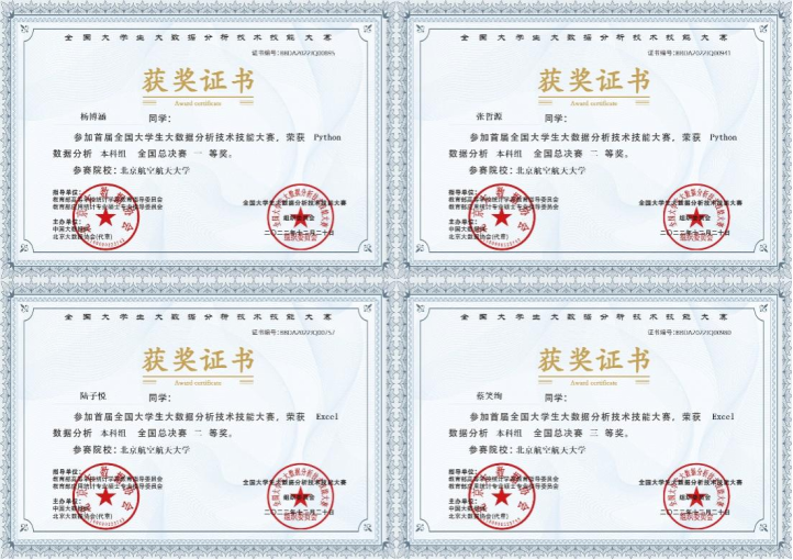 自本届比赛2022年8月启动以来,学院领导高度重视大力支持,统计与运筹系罗雪老师、刘超老师积极组织动员,我校共有24人次参加本次大赛,其中金年会jinnianhuicom20人,机械工程及自动化学院4人。通过刘超老师、戴蔚老师等的悉心指导,在省级赛中,24名参赛同学在万余名选手中脱颖而出,获得北京赛区一等奖4项、二等奖4项、三等奖6项等14项奖励。其中,我院本科生杨博涵、张哲源、蔡笑绚以及机械工程及自动化学院陆子悦等4名一等奖获得者晋级全国总决赛,经过激烈角逐,最终获得全国一等奖1项、全国二等奖2项和全国三等奖1项的优异成绩,同时获得北京大数据协会《初级数据分析师》证书。与此同时,刘超、戴蔚两位老师获得指导教师奖。