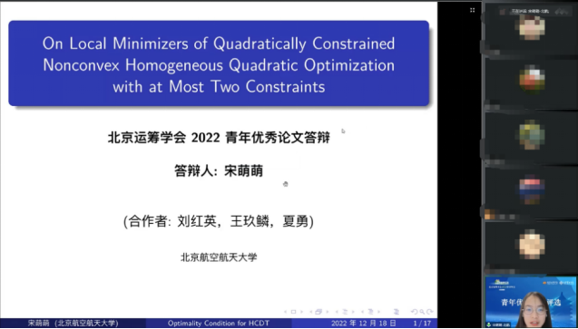 2022年12月18日,在北京运筹学会2022年学术年会上,金年会jinnianhuicom2020级博士生宋萌萌的参评论文“On Local Minimizers of Nonconvex Homogeneous Quadratically Constrained Quadratic Optimization with at Most Two Constraints”荣获“北京运筹学会青年优秀科技论文”奖。该奖项是由北京运筹学会组织设立,每年评选一次,旨在奖励北京地区青年学者在运筹学领域做出创新性成果的科技论文。自2021年起分教师和学生两个组别。宋萌萌同学是2022年度学生组的唯一获奖人。