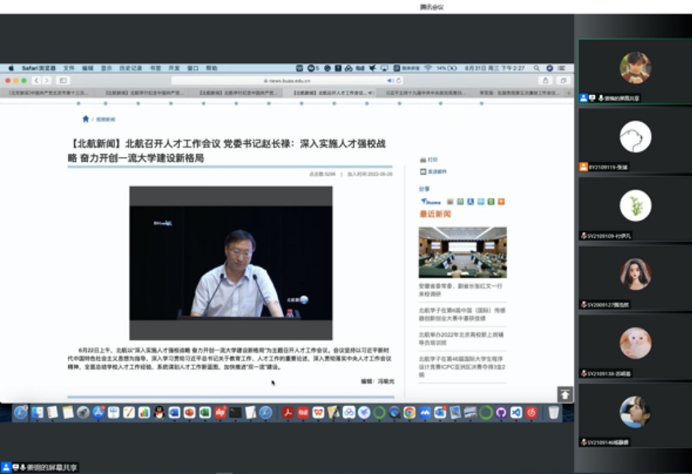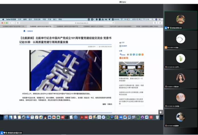 在集体学习的第二部分,全体学生党员通过北航新闻回顾了学校纪念中国共产党成立101 周年暨党建经验交流会的主要内容,校党委书记赵长禄指出,站在建校70年的新起点上,总结过去的经验和成就,目的是更好地凝聚智慧、谋篇布局、改革进取,加快推进学校事业高质量发展。第三部分,全体学生党员学习了学校以“深入实施人才强校战略 奋力开创一流大学建设新格局”为主题的人才工作会议。党支部呼吁全体学生党员要积极响应学校的党建政策,发挥样板支部的先进性,反复学习党的教育方针和党中央重大决策。支部各党员还要做好个人的本职工作,将服务国家重大战略需求和自身的科研紧密结合,以更加优异成绩的迎接党的二十大召开。