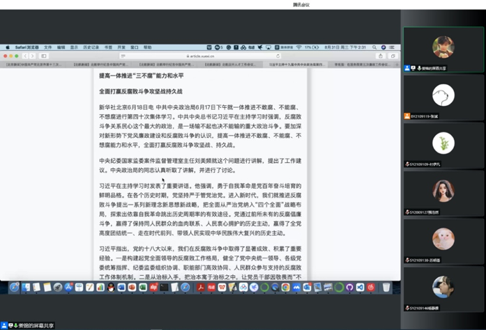 2022年8月31日下午,计算科学系师生联合党支部全体学生党员继续进行了第三季度反腐倡廉每季一课的学习,首先学习了习近平总书记主持十九届中共中央政治局第四十次集体学习发表重要讲话的内容,进一步加深全体党员对新形势下党风廉政建设和反腐败斗争的认识。其次,学习了李克强总理在国务院第五次廉政工作会议上的讲话,进一步向全体学生党员强调,要以习近平新时代中国特色社会主义思想为指导,树立正确的价值观,端正思想,严以律己,迎接党的二十大胜利召开。