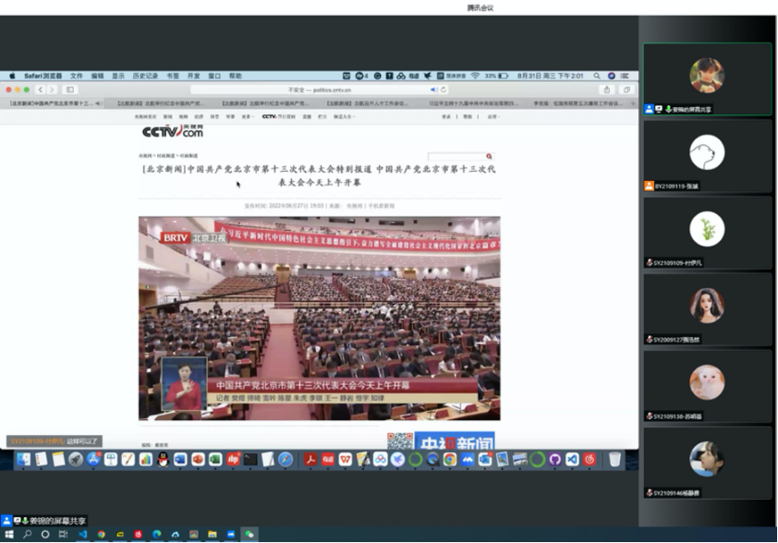 学习日内容共分为三个部分,在第一部分北京市第十三次党代会精神的集体学习中,全体学生党员共同观看了央视网视频报道,回顾了这次总结过去、规划未来的重要会议。北京市第十三次党代会对过去五年的工作做了全面的总结和梳理,并对未来五年的工作指明了方向,本次会议的召开,必将开启北京首都发展的新征程。支部副书记姜锦表示,我们作为高校学生,应该不忘初心,牢记使命,肩负起新时代青年的历史使命和时代责任,从自身做起,努力科研,认真学习,以实际行动迎接党的二十大胜利召开。
