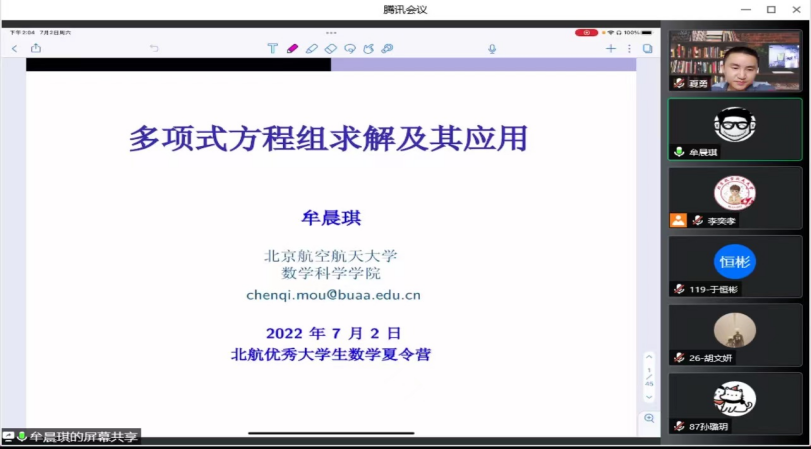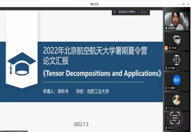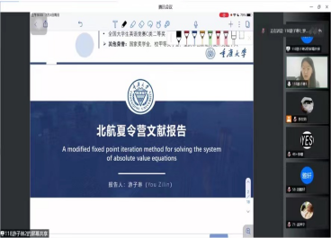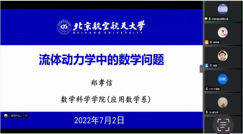 7月2日上午9:30在“腾讯会议”正式线上开营,学院党委书记袁星讲述了北航始终同服务国家战略紧密相连的发展历程,谈到了北航人代代传承的空天报国红色基因,为营员们上了一节生动的思想政治课,阐述了“为谁培养人、培养什么人、怎样培养人”,激发了青年学子的家国情怀和奉献担当。最后,袁星书记欢迎各位营员报考北航数学学院,共同为祖国贡献力量。夏勇副院长随后详细介绍了数学学院发展现状以及研究生招生、培养等情况,鼓励大家踊跃报考学院2023年研究生。
