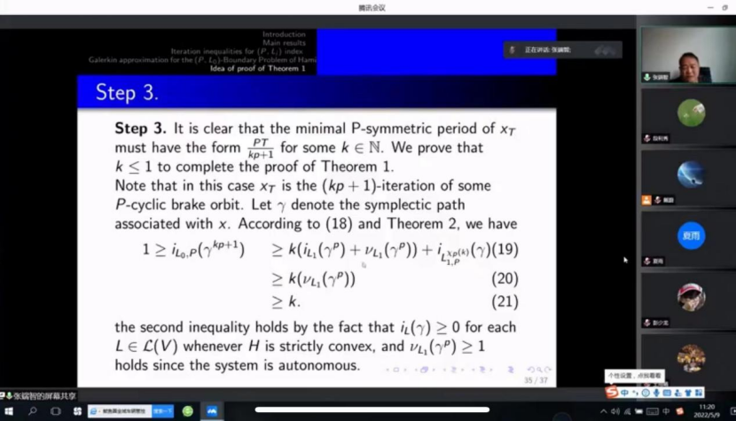 2022年5月9日上午,南开大学张端智教授应邀在“分析与偏微分方程讨论班”(2022春季第8讲)上为数学学院师生做了题为“Minimal P-cyclic periodic brake orbits in Hamiltonian systems”的线上学术报告,报告由戴蔚老师主持。