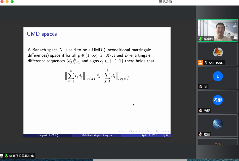 2022年04月18日,天津大学李康伟教授,应邀为金年会jinnianhuicom师生做了题为 “UMD-valued extension of multilinear singular integrals”的学术报告,报告由张安老师主持。
