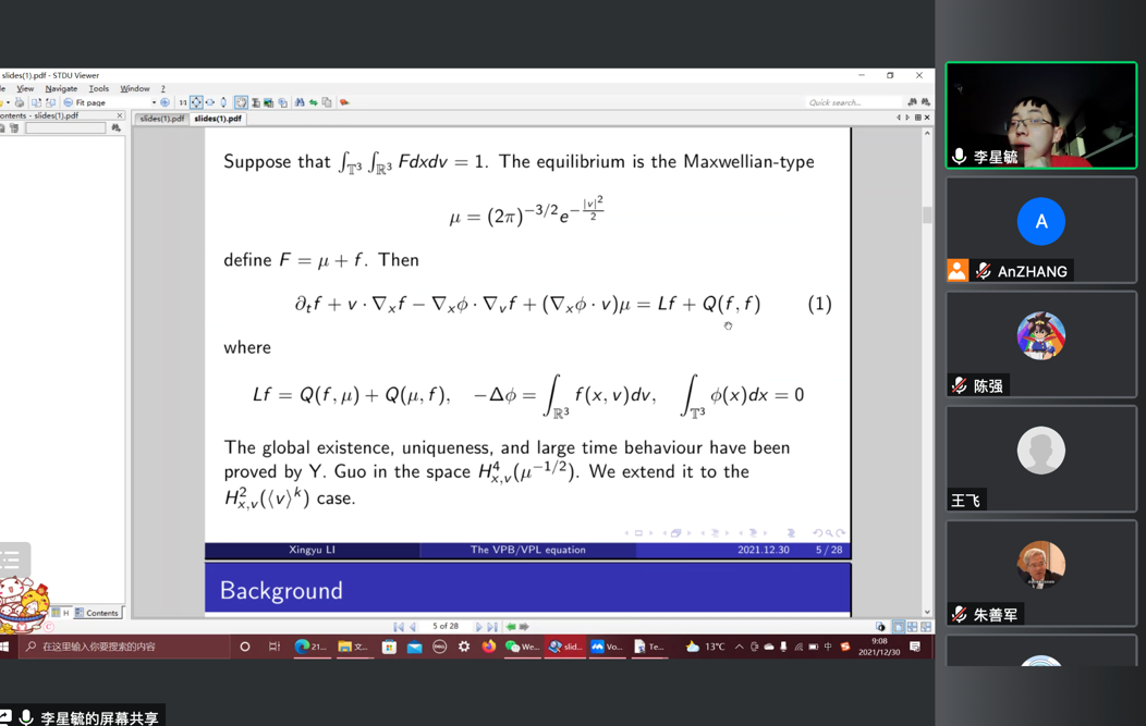 2021年12月30日下午,巴黎第九大学李星毓博士,应邀为金年会jinnianhuicom师生做了题为 “The Vlasov-Poisson-Boltzmann/Landau equation with polynomial perturbation near Maxwellian”的学术报告,报告由任天一和张安老师主持。
