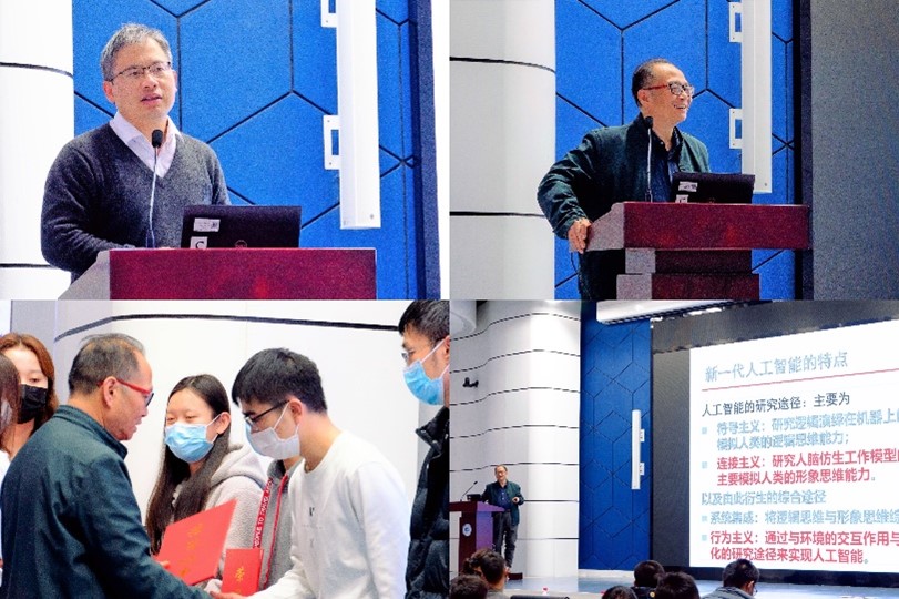 仪式后,巩馥洲做题为《新一代人工智能与概率论及优化计算》报告,深入浅出地介绍了人工智能领域与数学的联系,结合自身参与研究的实例生动形象地讲解了深度学习算法的改进思路,内容充实,富有启发性。