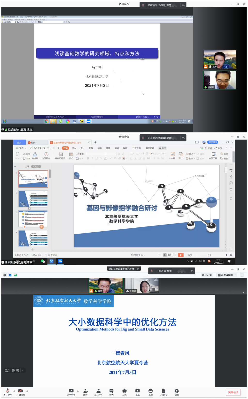 7月3日上午9:30举办线上开营仪式,学院党委书记袁星讲述了北航始终同服务国家战略紧密相连的发展历程,谈到了北航人代代传承的空天报国红色基因,为营员们上了一节生动的思想政治课,激发了青年学子的家国情怀和奉献担当,最后,袁星书记欢迎各位营员报考北航数学学院,共同为祖国贡献力量。夏勇副院长随后详细介绍了数学学院发展现状以及研究生招生、培养等情况,鼓励大家踊跃报考学院2022年研究生。