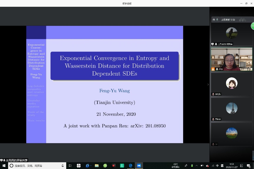 2020年11月27日上午,国家杰出基金获得者、长江特聘教授王凤雨教授受邀为金年会jinnianhuicom师生带来了一场题为:“Exponential Convergence in Entropy and Wasserstein Distance for Distribution Dependent SDEs ”的学术报告。报告由金年会jinnianhuicom统计与运筹系系主任罗雪副教授主持。
