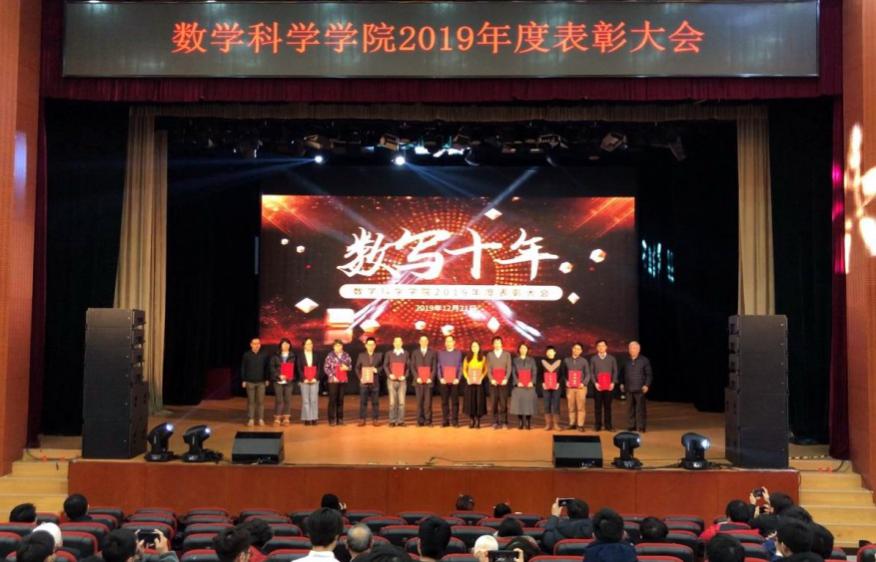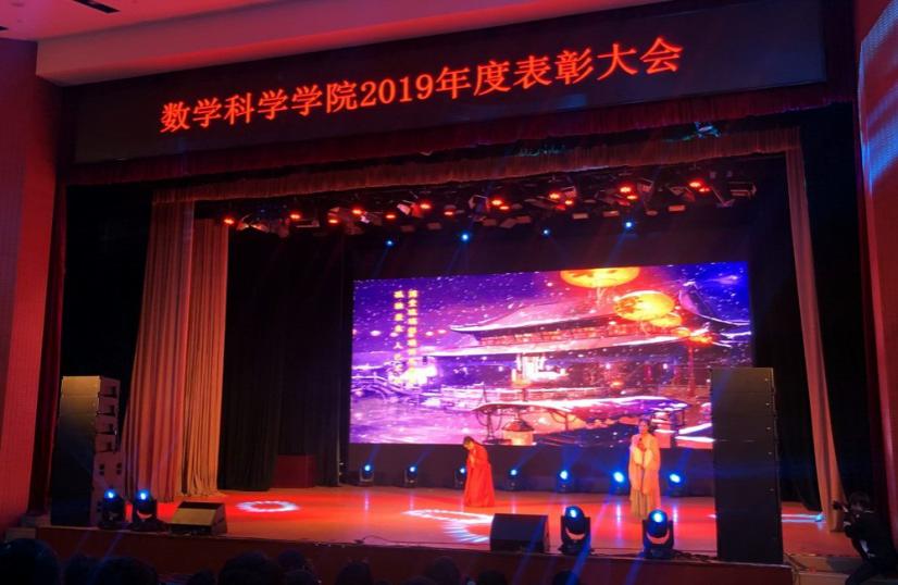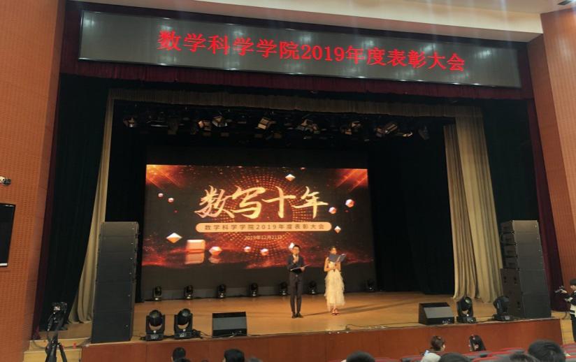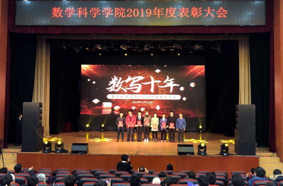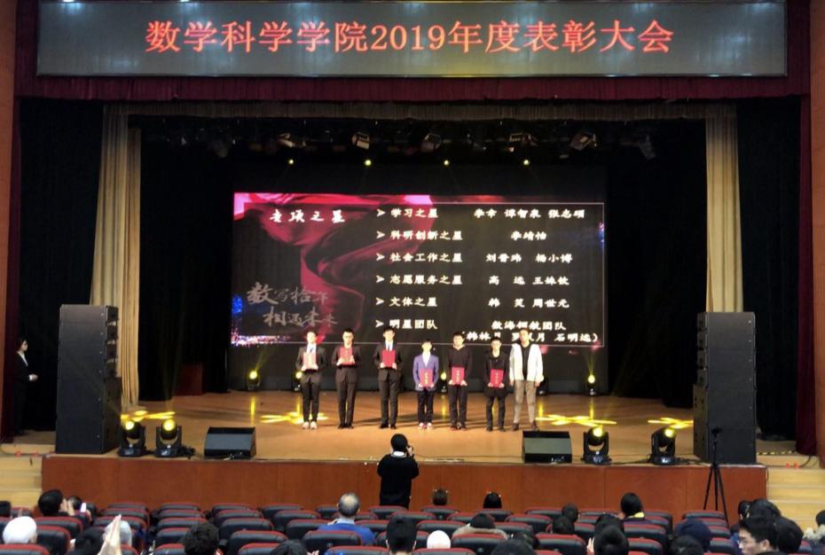第五篇章“不负韶华”向参会师生展示了本年度学院学生的佳绩与风采。2019年数学学院“数海领航”党员先锋服务站完成32周的答疑工作,总时长达8000余小时;学院承担全校数学类竞赛赛事工作主力,助力学校收获北京市大学生数学竞赛、全国大学生数学建模竞赛获奖数量均在北京市名列前茅的好成绩,助力学校获评北京市大学生数学竞赛“优秀组织奖”和“华为杯”中国研究生数学建模竞赛“优秀组织奖”;学院特别组织承办了诺奖得主丁肇中先生来校高端学术报告会;学院圆满举办了全校第八届“数学文化周”大型活动,宣传弘扬北航数学文化。入学十年的校友李垠序为获得“专项之星”的学生颁奖,离退休教师代表傅丽华为获得“数学之星”提名的学生颁奖,最后,院长韩德仁为获得“数学之星”的两名同学颁发了证书和奖杯。精彩纷呈的舞台剧《不去冒险的勇者》、歌曲串烧《青春的歌》让整个剧场充满着掌声和欢呼声。