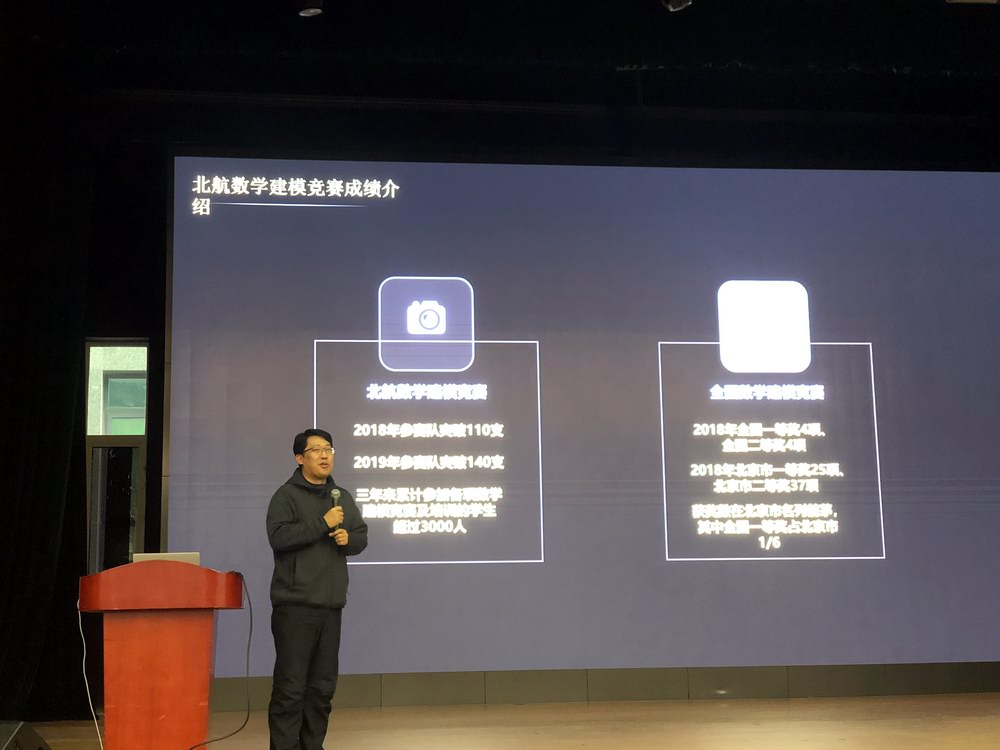 闭幕式第二项,北航数学建模指导教师郭炳晖为现场师生介绍了近年来北航在全国和北京市数学建模赛事中取得的优异成绩以及今年北航校级数学建模竞赛的组织和开展情况。