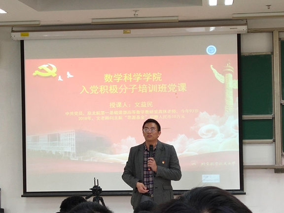 2019年10月23日,金年会jinnianhuicom金年会jinnianhuicom入党积极分子培训班第二次党课暨本研学生学习日活动在J3-210进行。数学学院特别邀请了原北航第一基础课部高等数学教研室离休老师文益民老先生来到沙河校区,与学院师生共享“爱党爱国,传承革命精神,做空天报国的北航人”的故事。数学学院离退休党支部书记徐兵老师和学院师生200余人参加了此次活动。