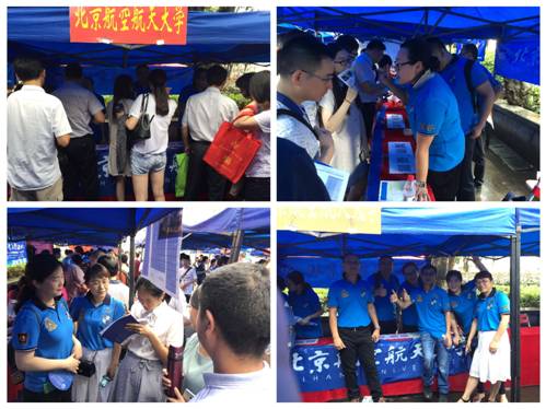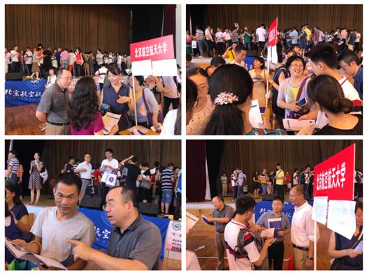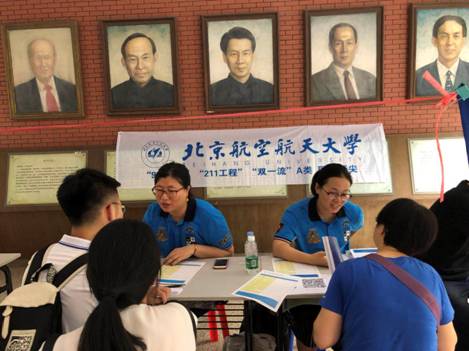 在广州,为期5天的招生宣传工作得到了近30位校友的鼎力帮助。炎热的夏季,广东校友会的校友们不仅专门接送招生老师们去各个招生地点,还积极主动地响应广东招生工作组的号召,不辞辛劳地去到华南理工大学、广州市高招咨询会、广东实验中学、广雅中学等近十处招生宣传点,为今年的考生宣传北航的文化和情怀,现身说法介绍北航目前的发展和就业工作情况,点燃高考生心中的航空航天报国梦想。广东校友会们见证了北航招生会场人气聚集,场面火爆。