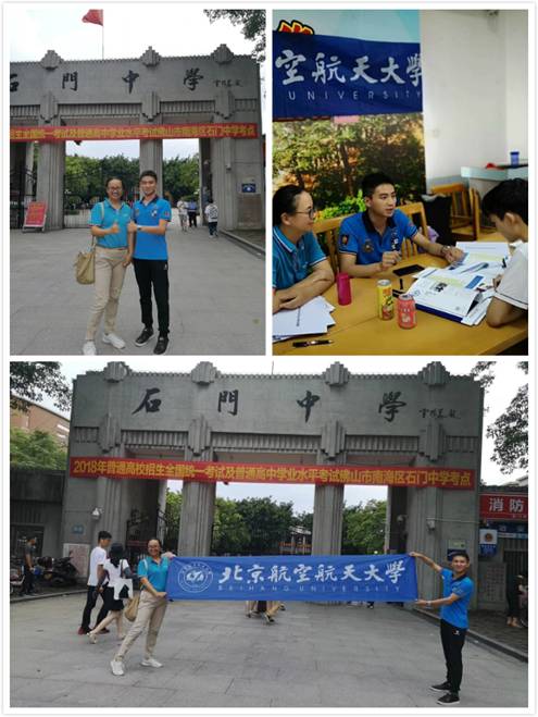 在佛山,北航佛山校友会副秘书长关琪校友和从深圳专门赶来的孙欣校友全程陪同学院老师开展招生工作,北航佛山校友会副会长李杰校友派出两位助手及专车保障学院老师的各项便利。两位校友如同及时雨,为学院老师提供了人力、物力等等各方面的支持。咨询现场,关琪校友和孙欣校友不遗余力地答疑解惑,眉飞色舞地介绍了母校的优势和特色,立体、生动、鲜活地讲述北航校史、专业选择、校园生活、校友成就等等。在佛山的数日,刚好赶上一年最热的时候,校友校友们不畏酷暑,东奔西走,每场必到,连续数日全天候、全身心投入高招工作,全情投入,辛勤付出,以饱满的热情、亲和的态度和耐心的讲解,展现了北航校友的风采。