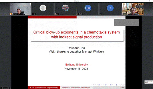 陶有山教授首先介绍了间接信号趋化模型的生物学背景、研究进程以及国内外研究的最新成果。随后,陶教授重点讲授了间接信号Keller-Segel模型解的爆破问题。通过构造爆破下解和利用抛物方程的比较原理,提供了一个证明解爆破的一个新思路。陶教授的报告内容前沿新颖、条理清晰,深入浅出,重点突出,在线师生听后深受启发,受益匪浅。