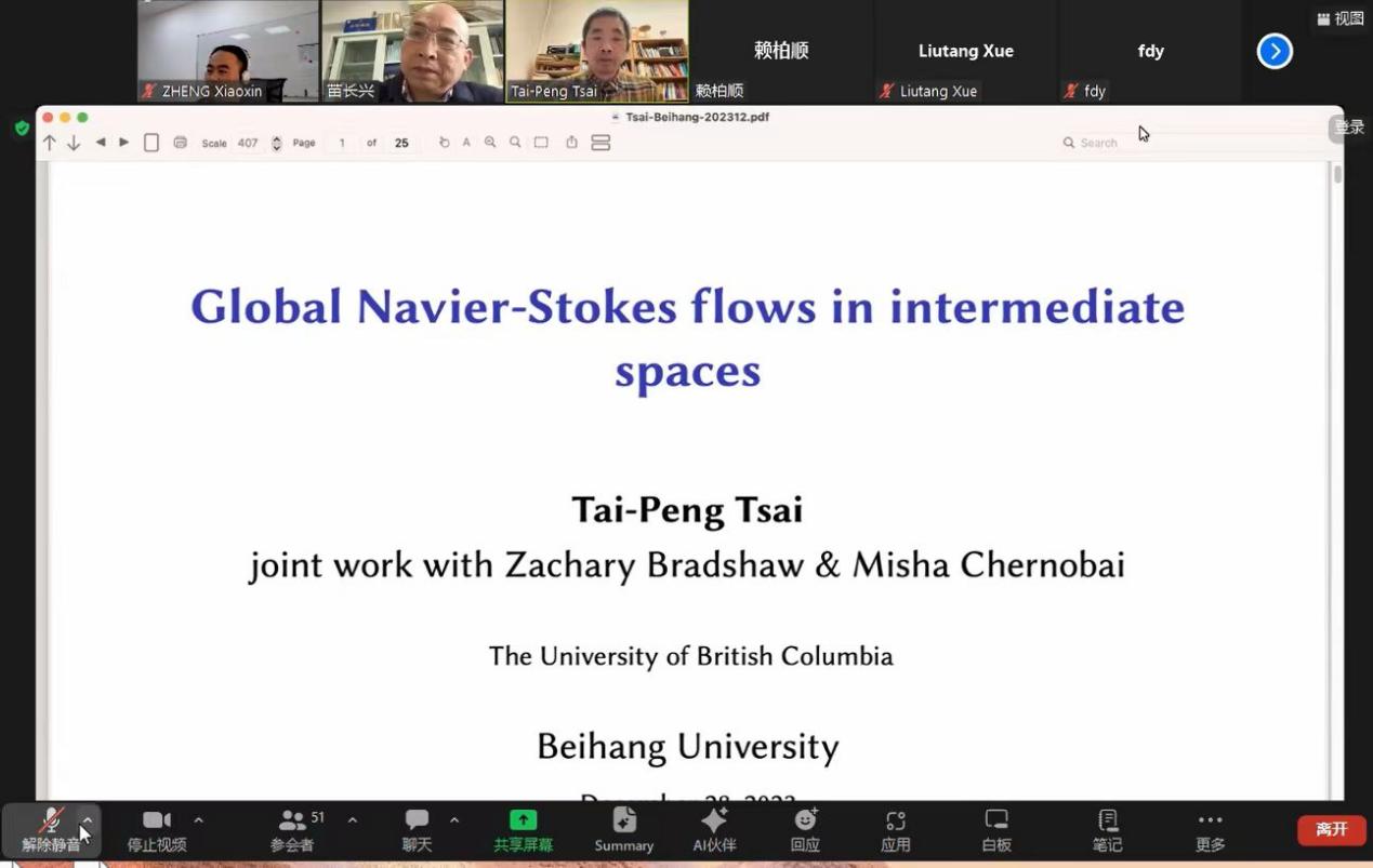 12月28日,加拿大英属哥伦比亚大学数学系蔡岱朋教授应邀来到北航应用数学系做了题为 “Global Navier-Stokes flows in intermediate spaces”的线上学术报告。此次报告由应用数学系郑孝信老师主持,相关研究领域的师生参加了本次活动。
