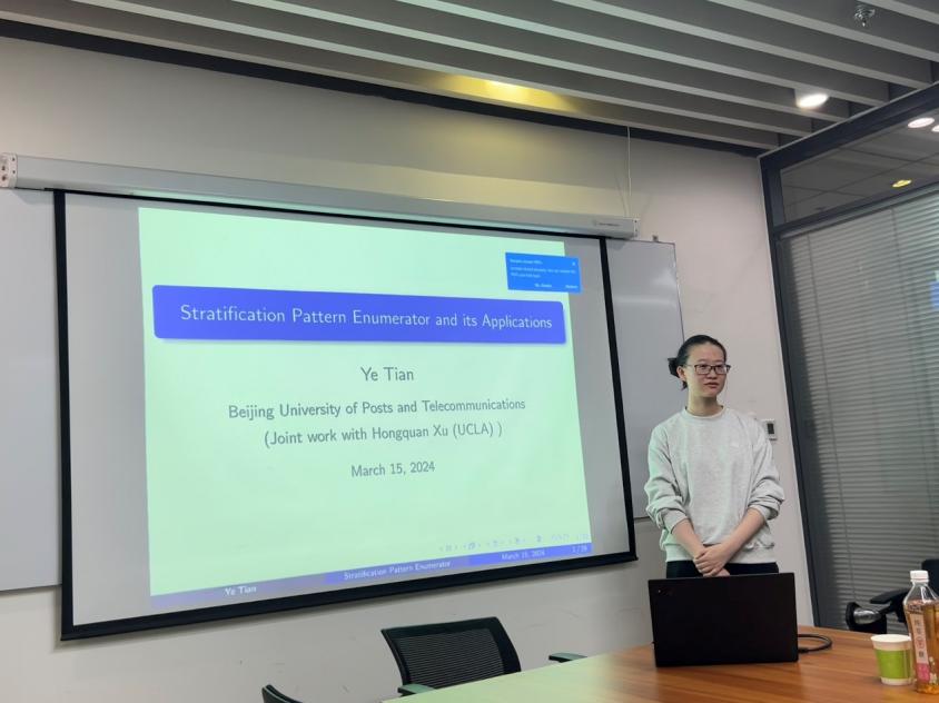 2024年3月15日,北京邮电大学田烨特聘副研究员应罗雪老师的邀请,在E706为数学学院的师生带来了一场题为“Stratification pattern enumerator and its applications”的学术报告。