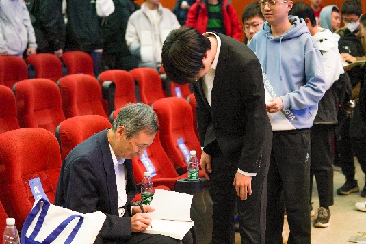 “越单纯,你就会走得越远。”讲座结束后,席南华院士和同学们深度交流。随后,席院士为本届数学文化节赠送了自己主编的《数学:简单与高深》和《认识数学》系列科普书,并受邀为同学们签名合影,希望各位同学充分感受数学之趣,在数学之路上行有所获。