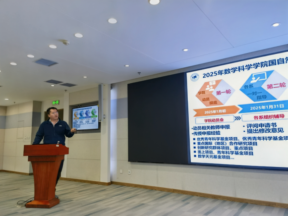韩德仁对学院教师进行国自然基金项目申报动员。他肯定了过去一年学院教师在科研工作中取得的成绩,并表示学院将全力支持教师的申报工作,拟邀请校内外专家提供全方位的指导和帮助。希望各位老师充分结合学校UPS国际化发展战略,凝练规划个人科研工作未来方向,树立信心、鼓足干劲,积极申报国自然基金项目,在项目研究中突破数学难题、服务国家需求、培育拔尖人才。