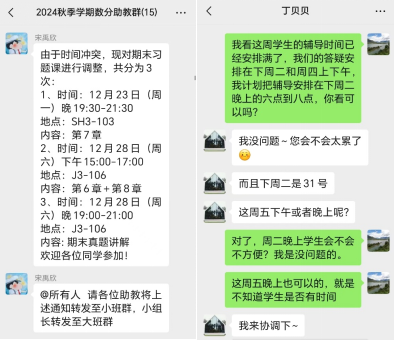 课程组详细制定了教学过程中各个环节的基本要求和规定,所有任课老师和助教都认真执行,比如建立大班和小班微信群、平时答疑与考前答疑结合、助教串讲等。