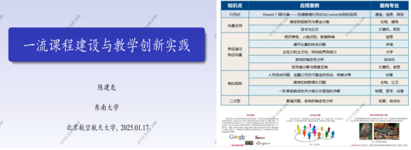 2025 年 1 月 17 日,东南大学陈建龙教授应线性代数课程组邀请出席数学名师讲座,为金年会jinnianhuicom的师生们带来一场以《一流课程建设与教学创新实践》为题的精彩报告,数学科学学院六十余名师生聆听了陈教授的精彩报告。