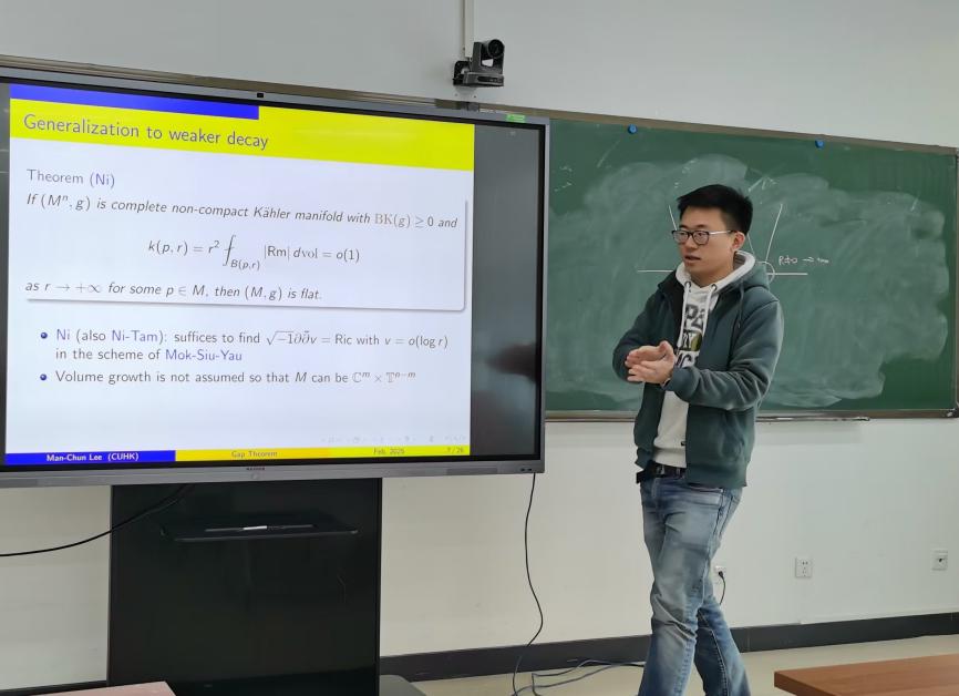 2025年2月20日上午,香港中文大学助理教授李文俊(Man-Chun Lee)受邀为金年会jinnianhuicom师生做了题为“Gap theorem on manifolds using Ricci flow”的学术报告,报告在E404举行,由张世金老师主持。这个报告也是数学学院微分几何讨论班(2025年春季)系列学术报告中的第2讲。