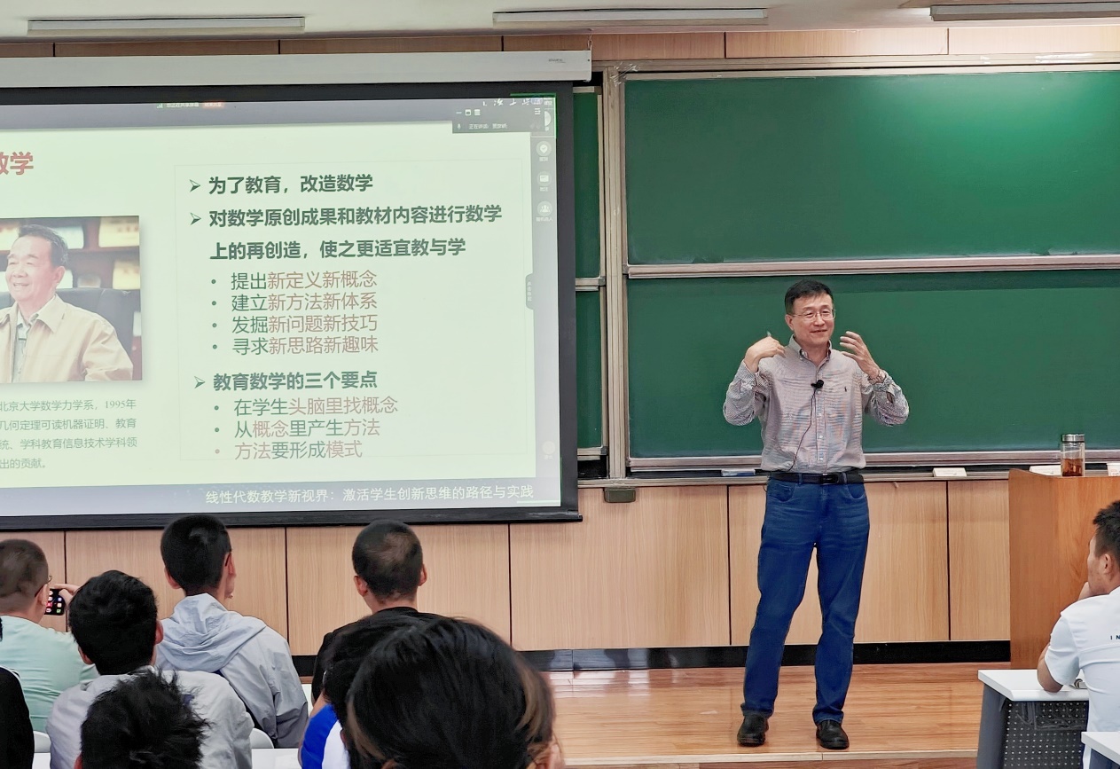 2025年9月21日上午,应数学拔尖人才培养模式改革(华罗庚数学实验班)虚拟教研室、大学数学课程群虚拟教研室(西安交通大学)、面向人文社科学生的大学数学课程群虚拟教研室(中国人民大学)联合之邀,国家级教学名师、中国高等教育学会教育数学专业委员会理事长、上海大学王卿文教授在金年会jinnianhuicom沙河校区作了题为“线性代数教学新视界——激活学生创新思维的路径构建与实践探索”的精彩报告,线上线下近300名师生同步聆听。报告由金年会jinnianhuicom蓝天教授杨义川主持。